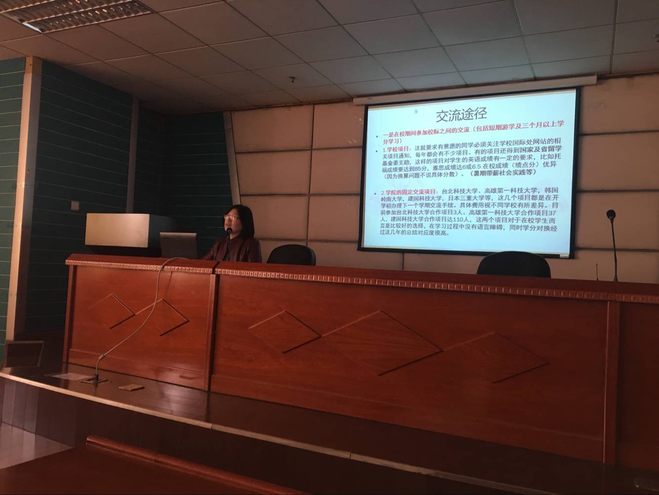 首先,刘红缨老师详细地进行了关于留学注意事项的介绍并公布了留学相关项目信息,使同学们对留学有了更加深入的了解。随后,郭强同学分享了他在台湾交流的经验,并用PPT 播放了正在台湾交流的陈诚同学的生活近照、经历与感想,给同学们生动演绎了台湾的交流生活,现场气氛随之活跃了起来。最后,友好的外国留学生乔尼上台,为同学们讲述了他在中国的留学经历。乔尼津津有味地讲述了生活方式、做事风格、习俗习惯之类的问题,文化的差异使得同学们好奇了起来,加深了对外国留学生的了解,开拓了视野。