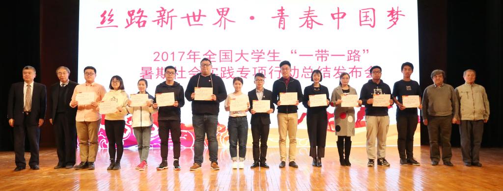 11月30日下午,“丝路新世界?青春中国梦”2017年全国大学生“一带一路”暑期社会实践专项行动总结会在京举行。我院“你好,新丝路”、“筑梦青春”两支实践团队从全国1300多个团队中脱颖而出,获得“一带一路”暑期社会实践优秀团队奖,16级研究生于泽聪同学、15级本科生龙亦青同学获得“一带一路”暑期社会实践优秀个人奖。其中龙亦青作为20支优秀团队之一代表进行了现场演讲。