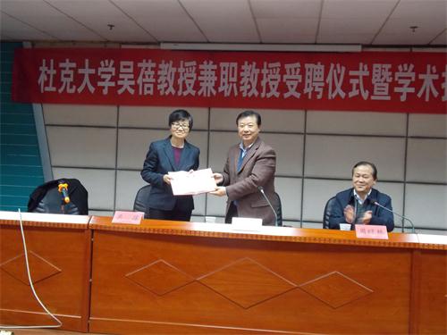 11月24日下午,美国杜克大学护理学院终身荣誉教授、国际研究主任吴蓓教授应邀莅临我校,在三江楼1501报告厅受聘我校兼职教授并作学术报告。江苏大学党委副书记、纪委书记许化溪教授出席受聘仪式并亲手为吴蓓教授颁发聘书、佩戴校徽,管理学院党委书记周绿林教授主持受聘仪式与学术报告会,我校相关专业师生近一百人参加了受聘仪式与学术报告会。
